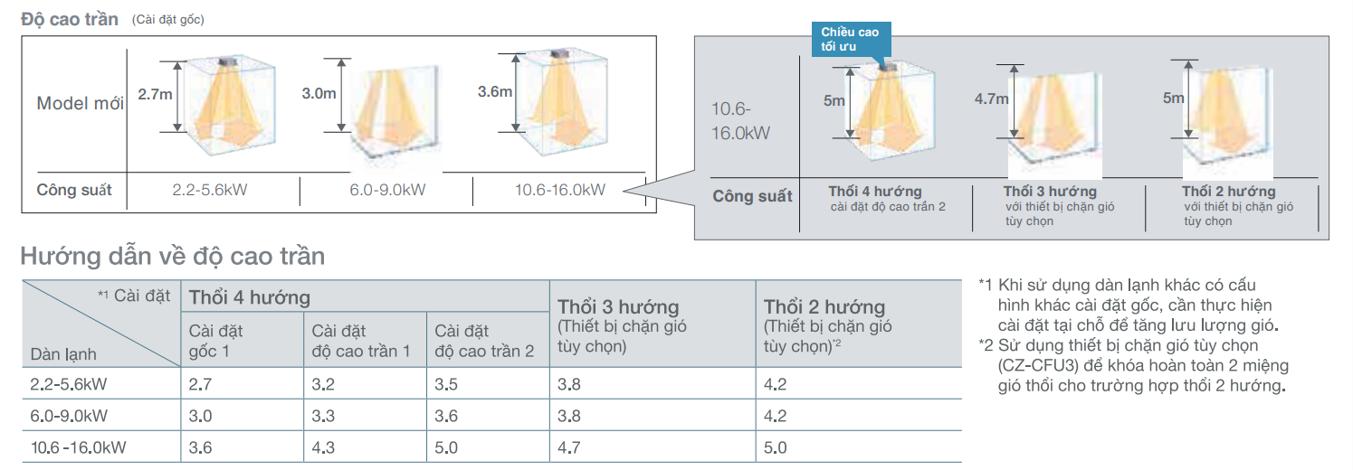 Cho phép duy trì chiều cao trần nhàCó thể lắp đặt các thiết bị này trong những căn phòng trần cao, nơi có nhiều hệ thống sưởi ngang sàn vào mùa đông. 1. Cài đặt trần cao cho hệ thống xả khí 4 hướng thổi 2 *Khi sử dụng thiết bị ở cấu hình khác với cài đặt gốc, cần thực hiện cài đặt tại chỗ để tăng luồng khí. **Sử dụng vật liệu chặn khí (CZ-CFU3) để chặn hoàn toàn hai cửa xả đối với luồng khí 2 chiều.
