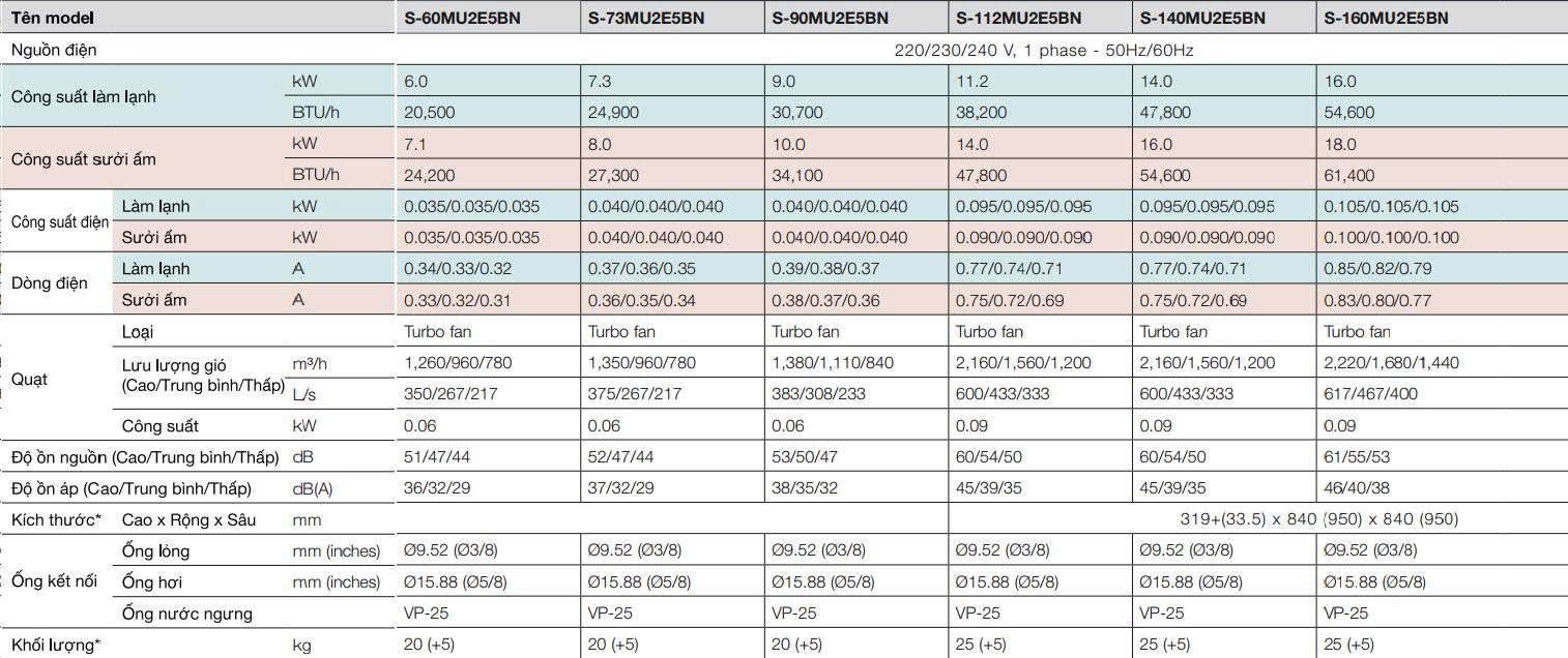 Lưu ý: Bảng này hiển thị các giá trị cho lưu lượng gió ở chế độ cao.