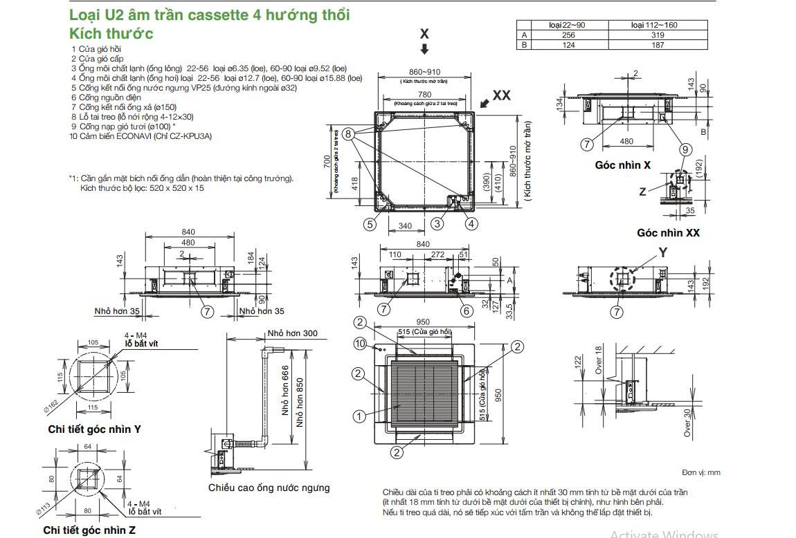 Lưu ý: Điều hòa âm trần cassette 4 hướng thổi loại 11,2-16,0 kW